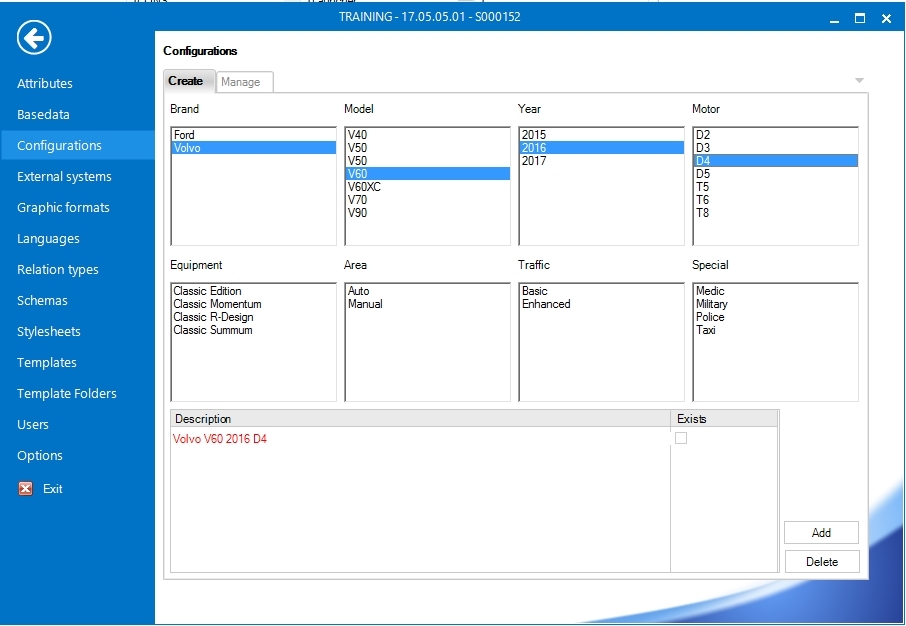 17. Example for a "Volvo V60 2017 D4" in File/Configurations. In this example the combination does not exist, so is marked in red.